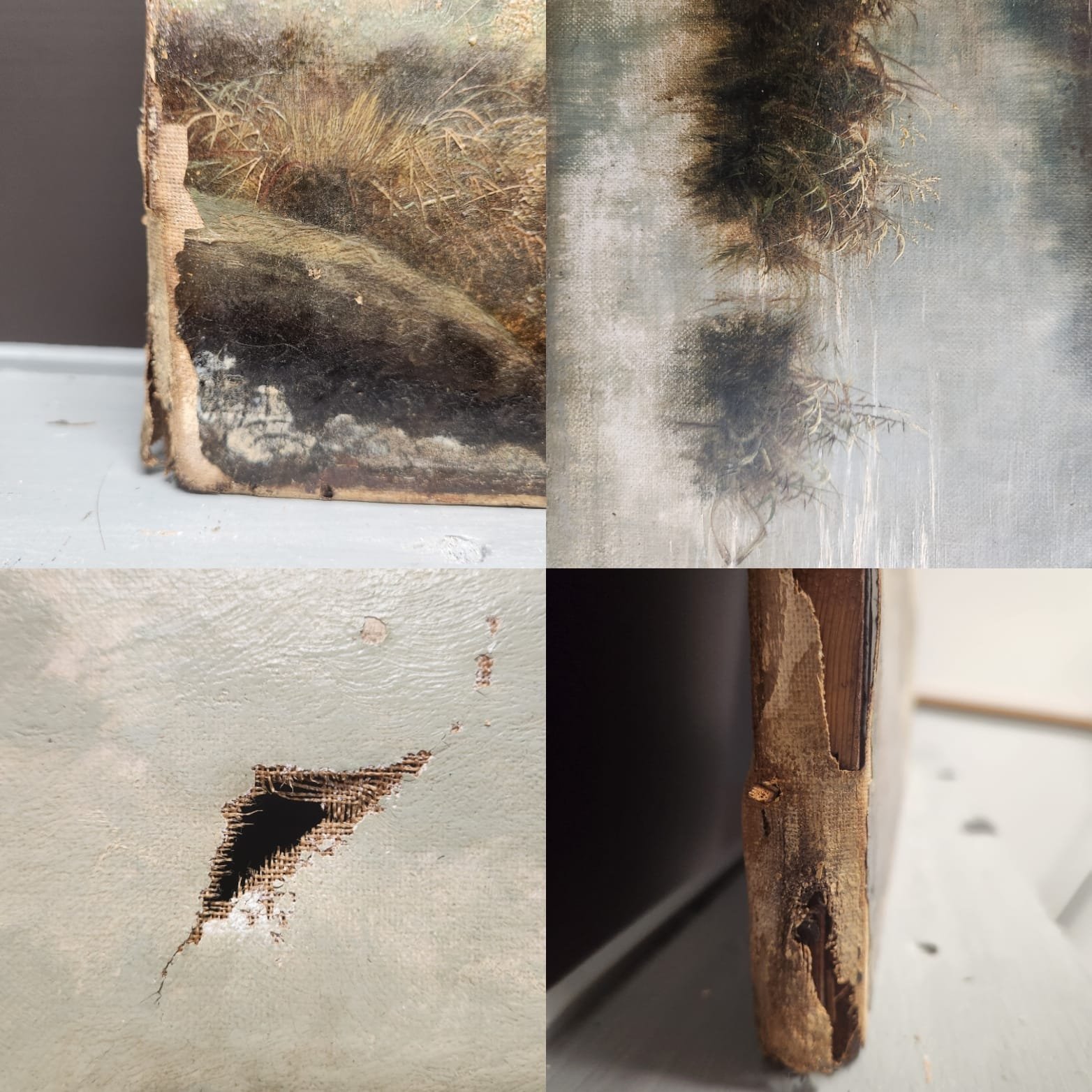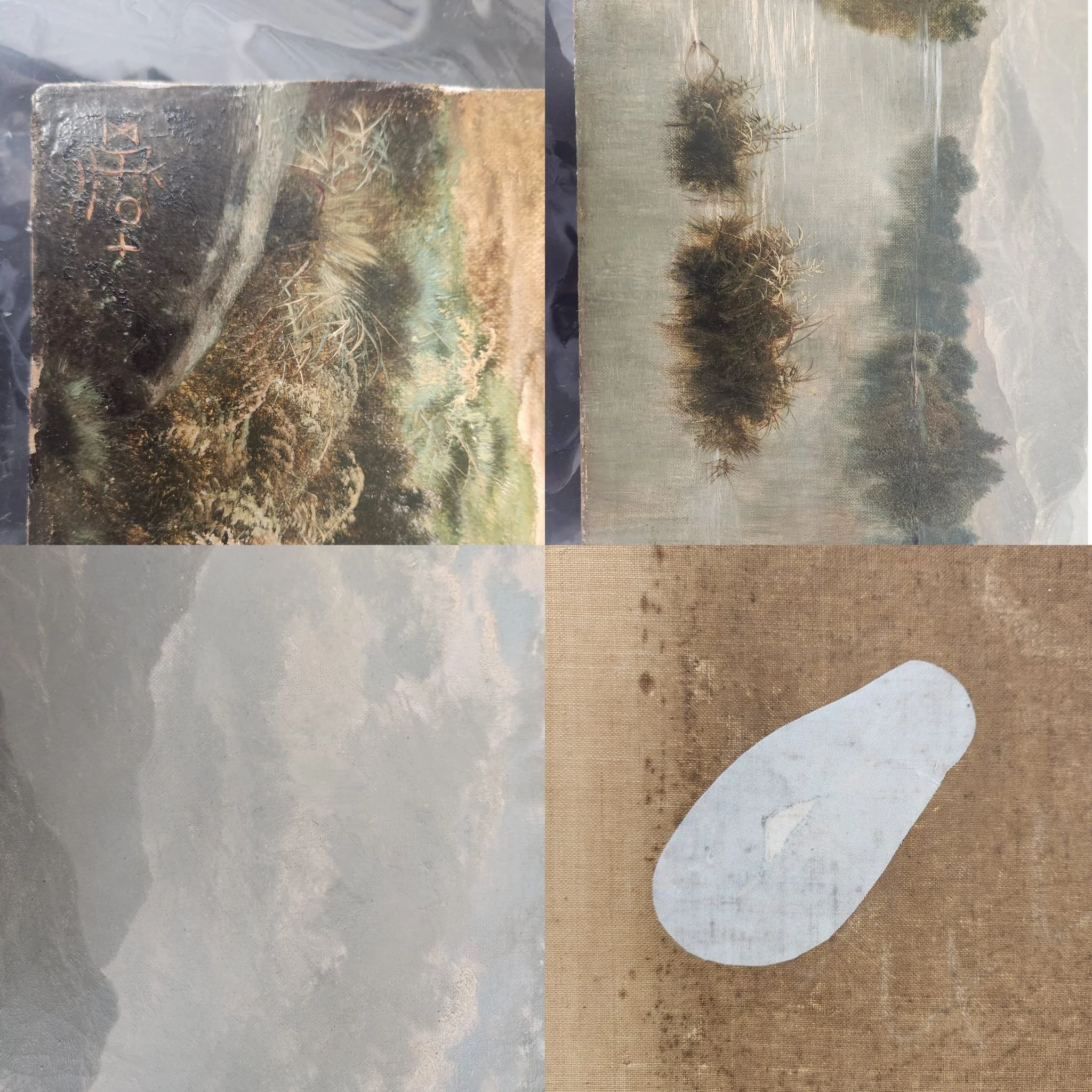 (Image top left: before treatment. Image top right: before treatment detail images). This oil on canvas painting titled “Loch Lomond” had surface grime, varnish discolouration, tearing, paint loss and abrasions due to storge conditions and aging. The surface was cleaned with 1% trisodium phosphate and the varnish was removed with isopropanol. The painting was strip lined with BEVA film and thin woven polyester sheeting and the tear in the canvas was stabalized with a BEVA patch. The paint was consolidated with diluted PVA and the painting was retouched with earth pigments and AYAC. The painting was varnished with a mixture of B67, mineral spirits and waxes. The painting was reinstalled into the original frame which was conserved as part of this project (see above).