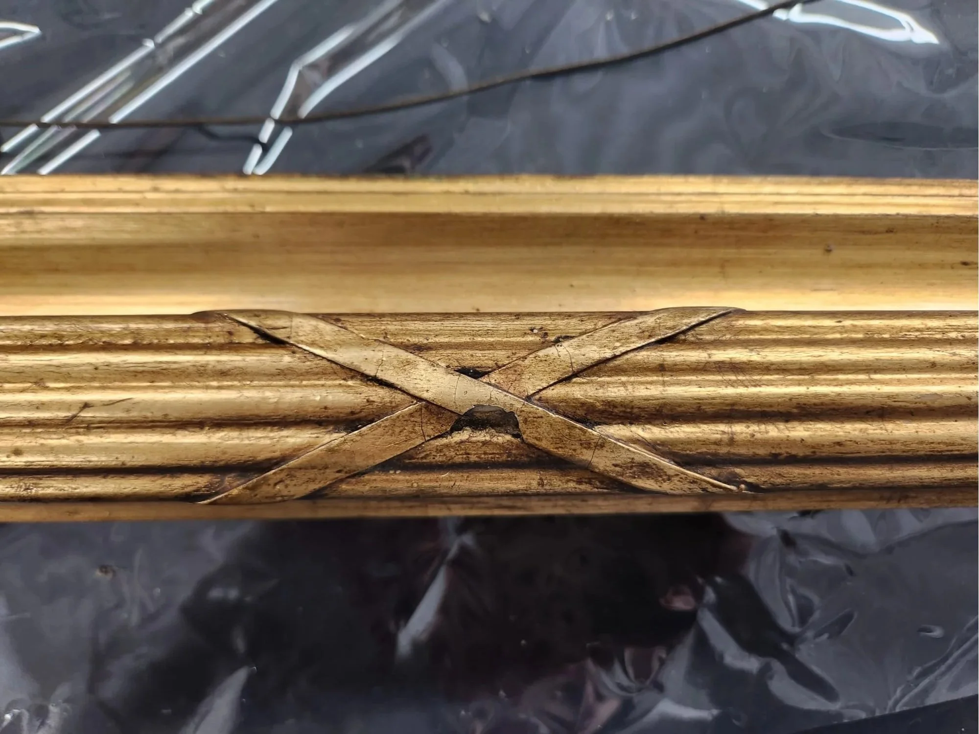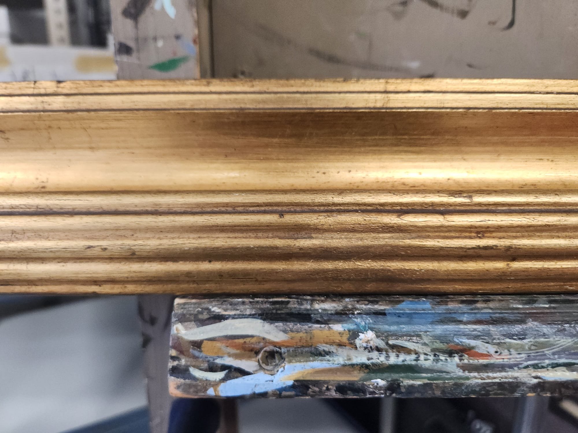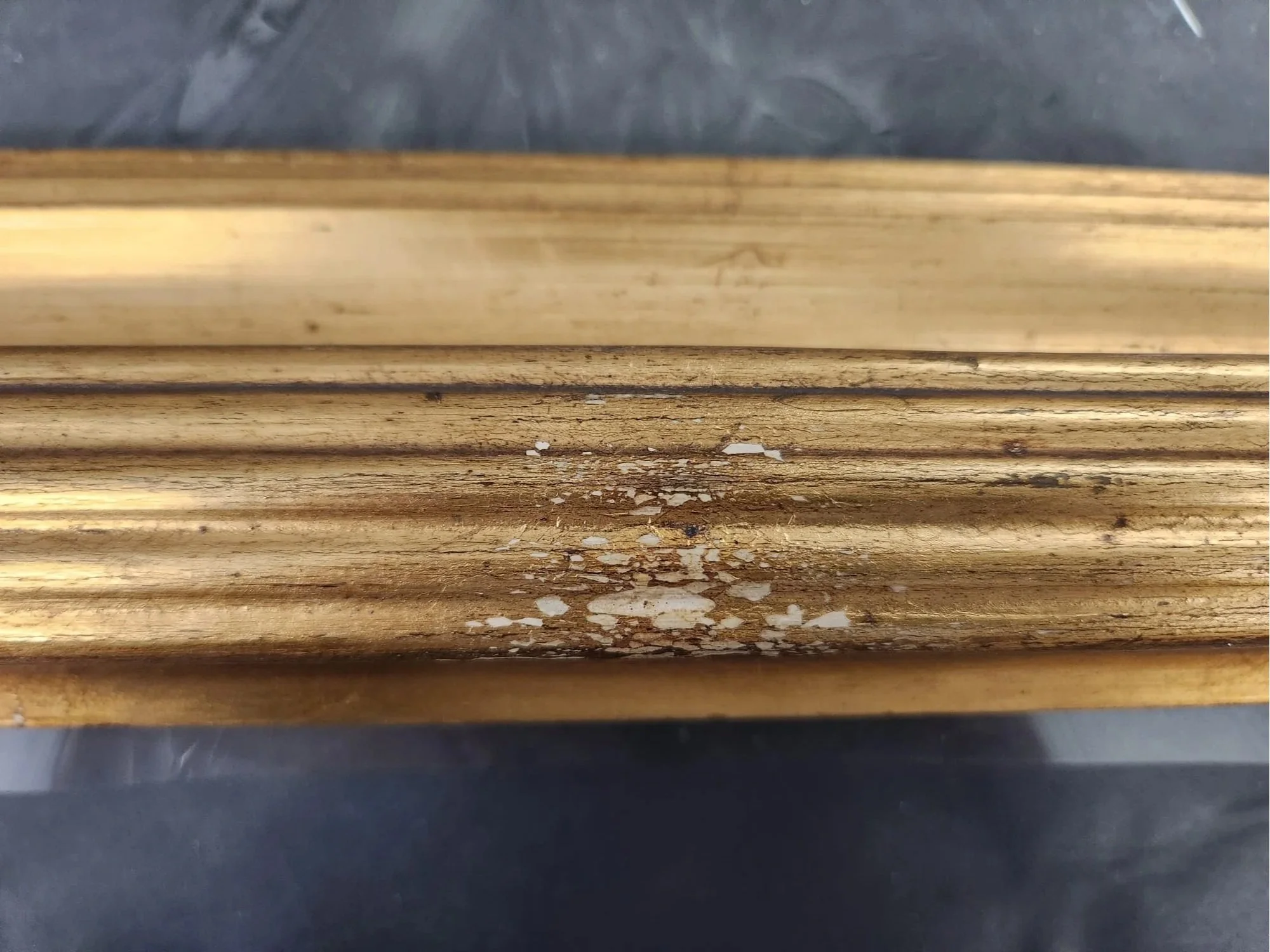 (Image top left: before treatment. Image top right: before treatment detail images). This frame was an inherited project from a previous conservator. This frame experienced a few losses that required fills. Using wood filler, the previous conservator filled in the areas of loss. Upon inheritance of the project, sandpaper was used to smooth the filler to integrate with the rest of the frame. For the corner loss, a dental tool was used to hand-carve the ornament to match the existing. Acrylic paints were used to match the existing chroma of the frame.