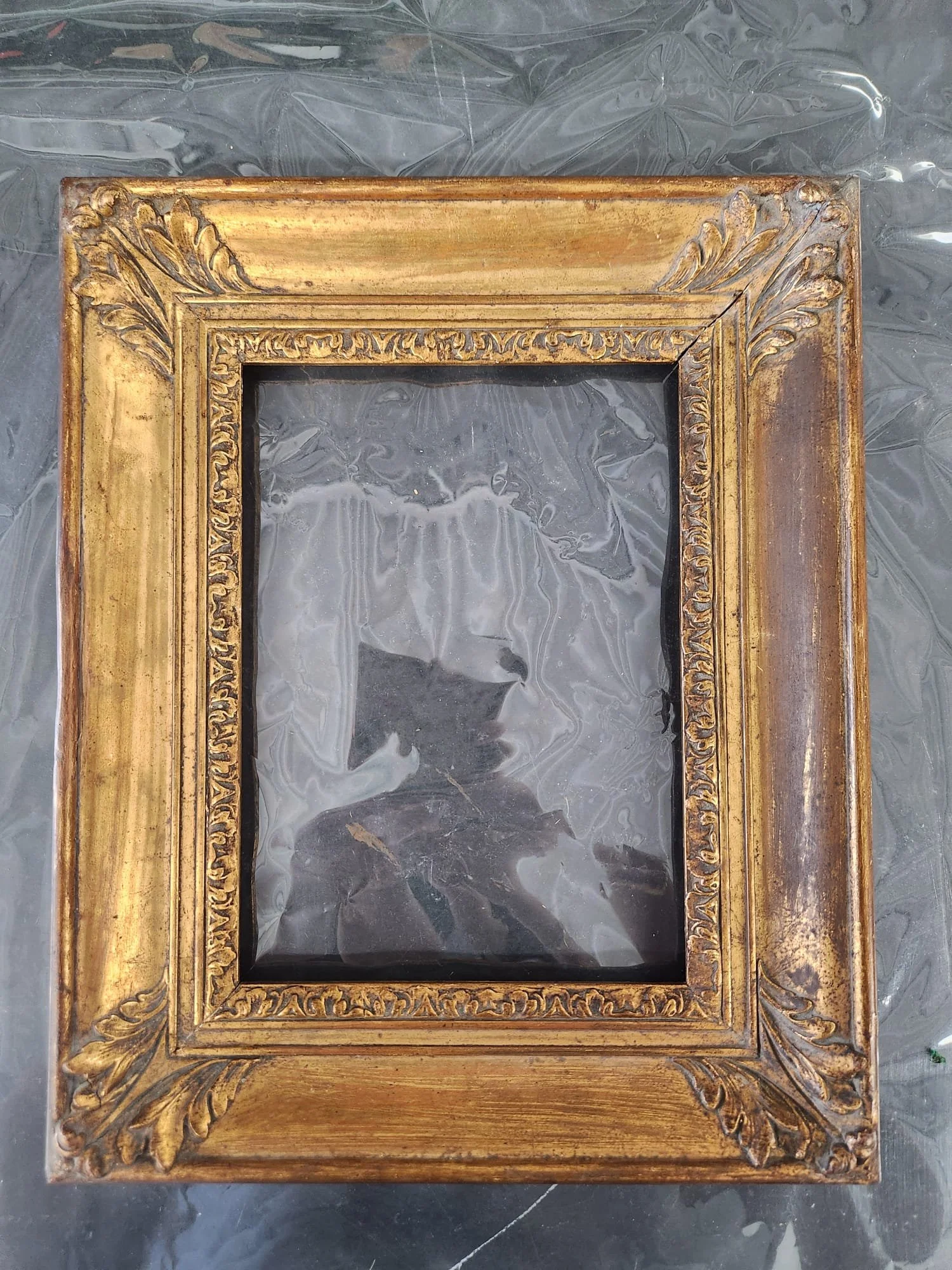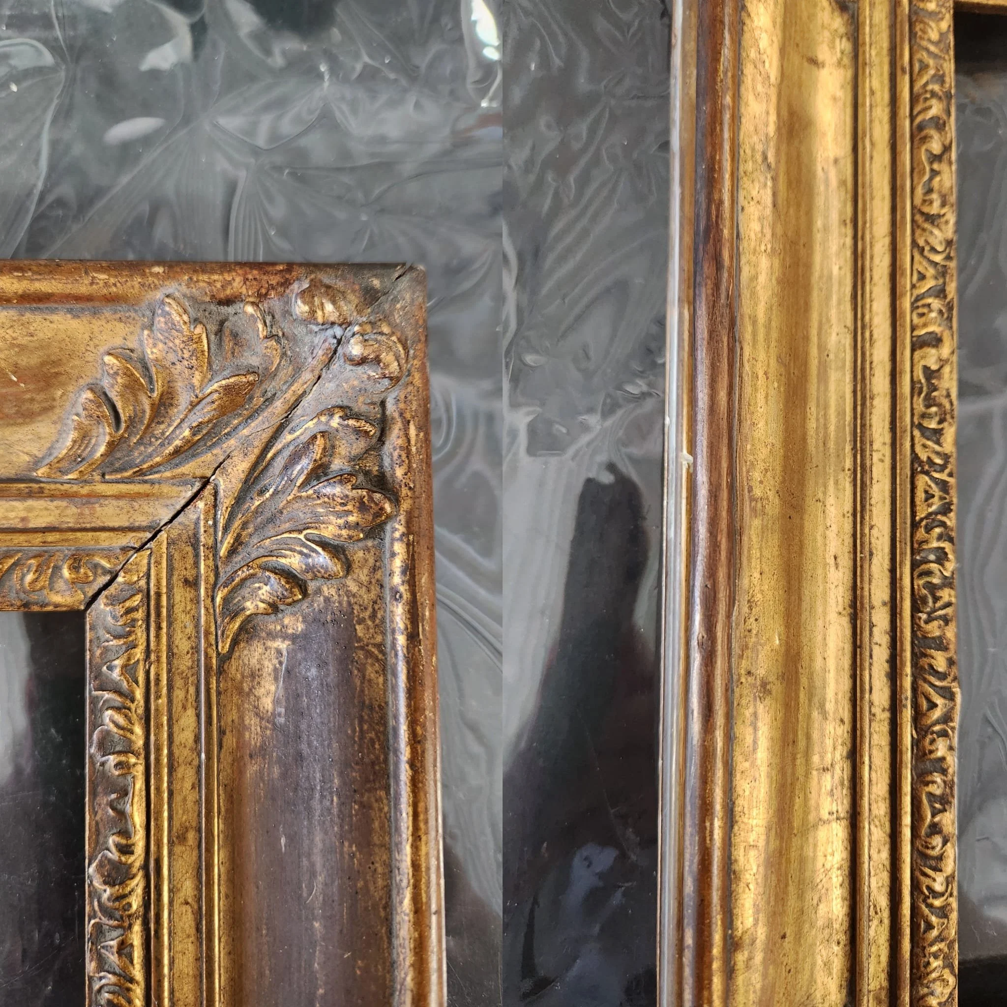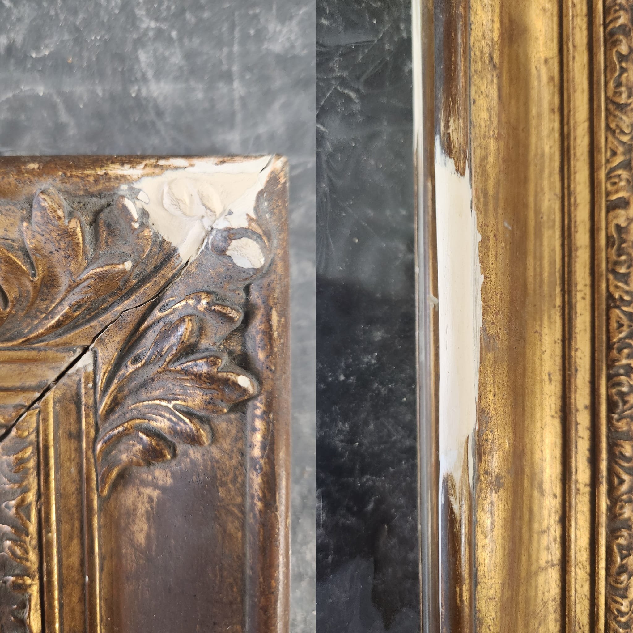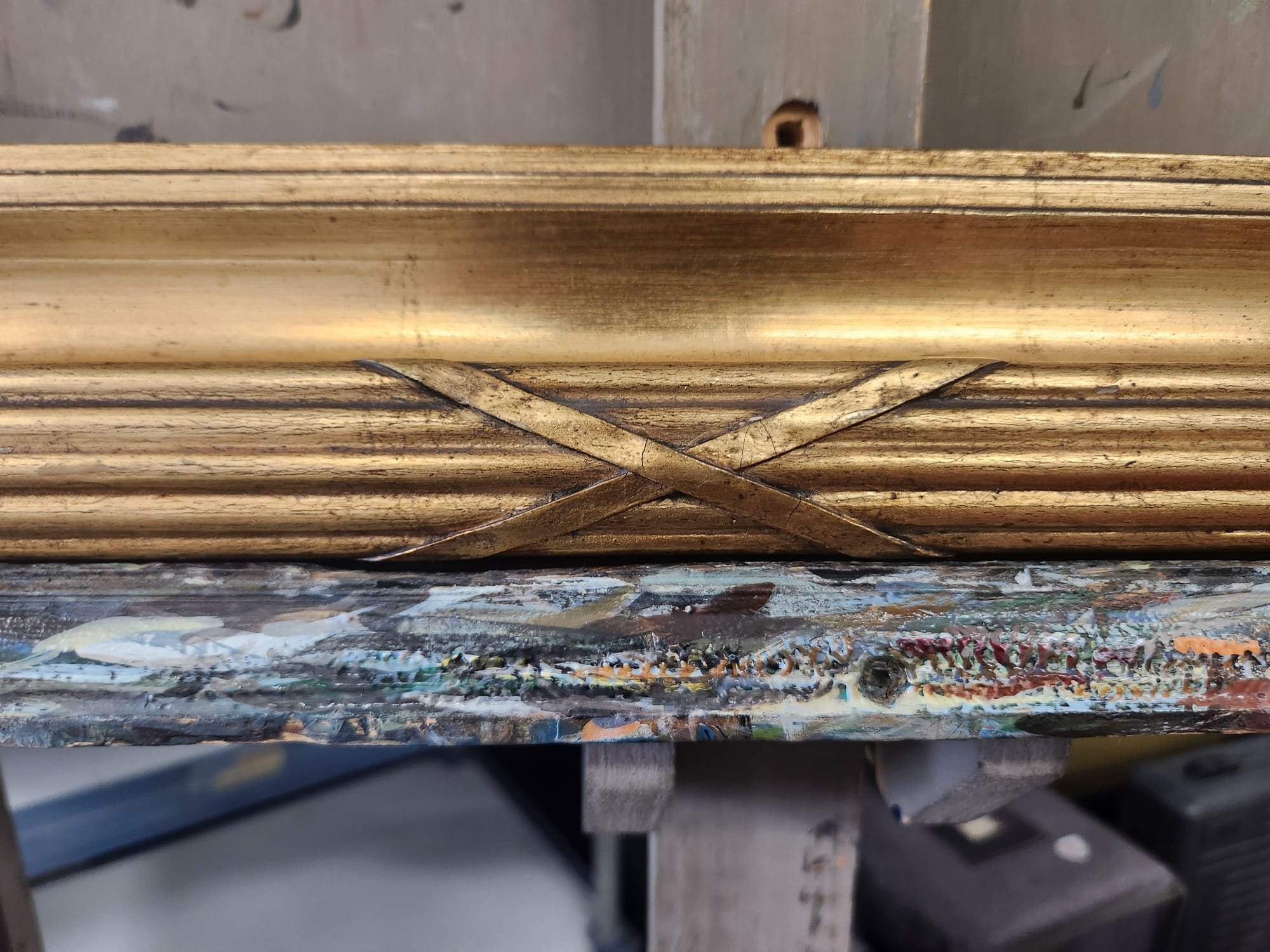 (Image top left: before treatment. Image top right: before treatment detail images). This frame was an inherited project from a previous conservator. This frame experienced a few losses that required fills. Using wood filler, the previous conservator filled in the areas of loss. Upon inheritance of the project, sandpaper was used to smooth the filler to integrate with the rest of the frame. For the corner loss, a dental tool was used to hand-carve the ornament to match the existing. Acrylic paints were used to match the existing chroma of the frame.