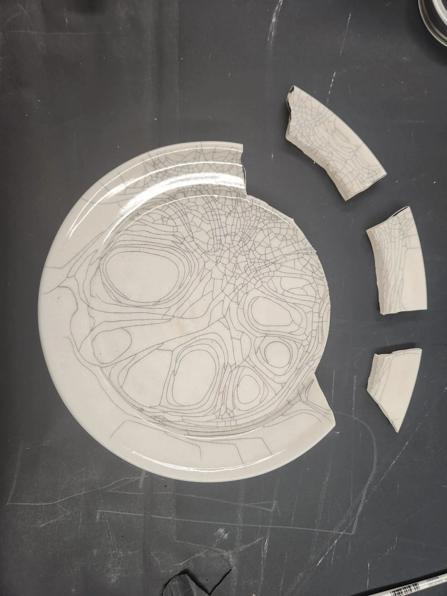 (Image left: post breakage, image middle: mapping with painter’s tape, image right: after repair). This ceramic-ware plate was broken and then repaired with 40% Polaroid B-72 in acetone. A loss-sherd was discarded and recreated using Plaster of Paris. The plaster was then painted with acrylic paint to replicate the loss.